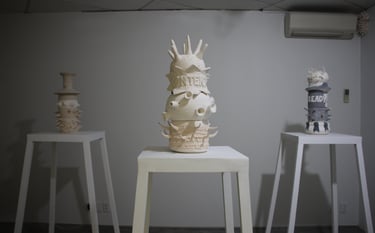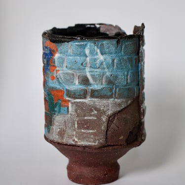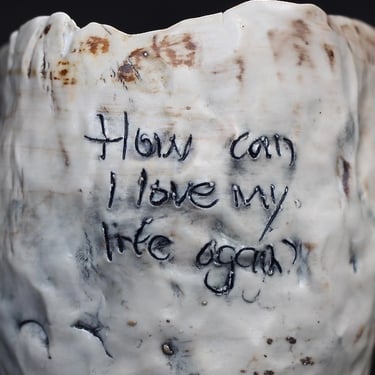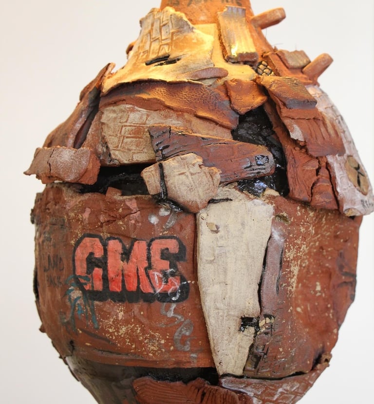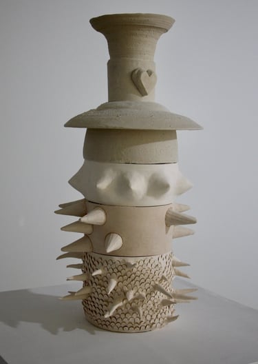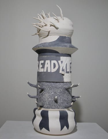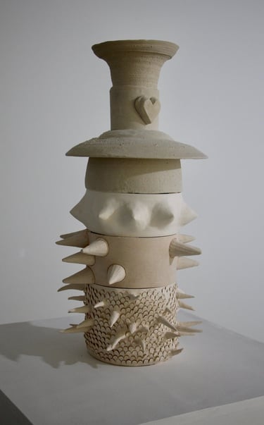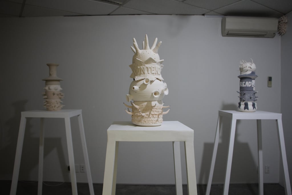 These clay pots are made up from individual pieces. Based on planters, they represent a container for growth. Precariously stacked into posts, they appear larger or more important, with words indicating a hoped-for self. These works address an emerging future where idealised reality is more attractive than real life.